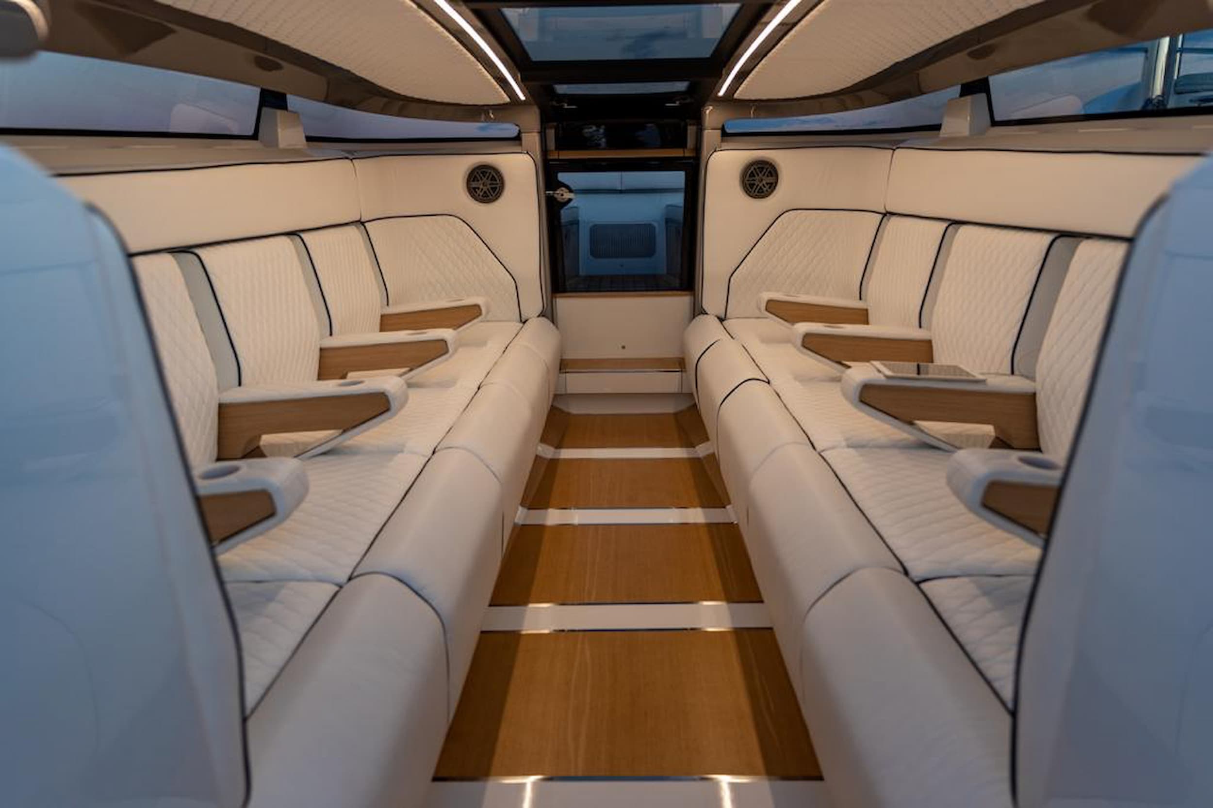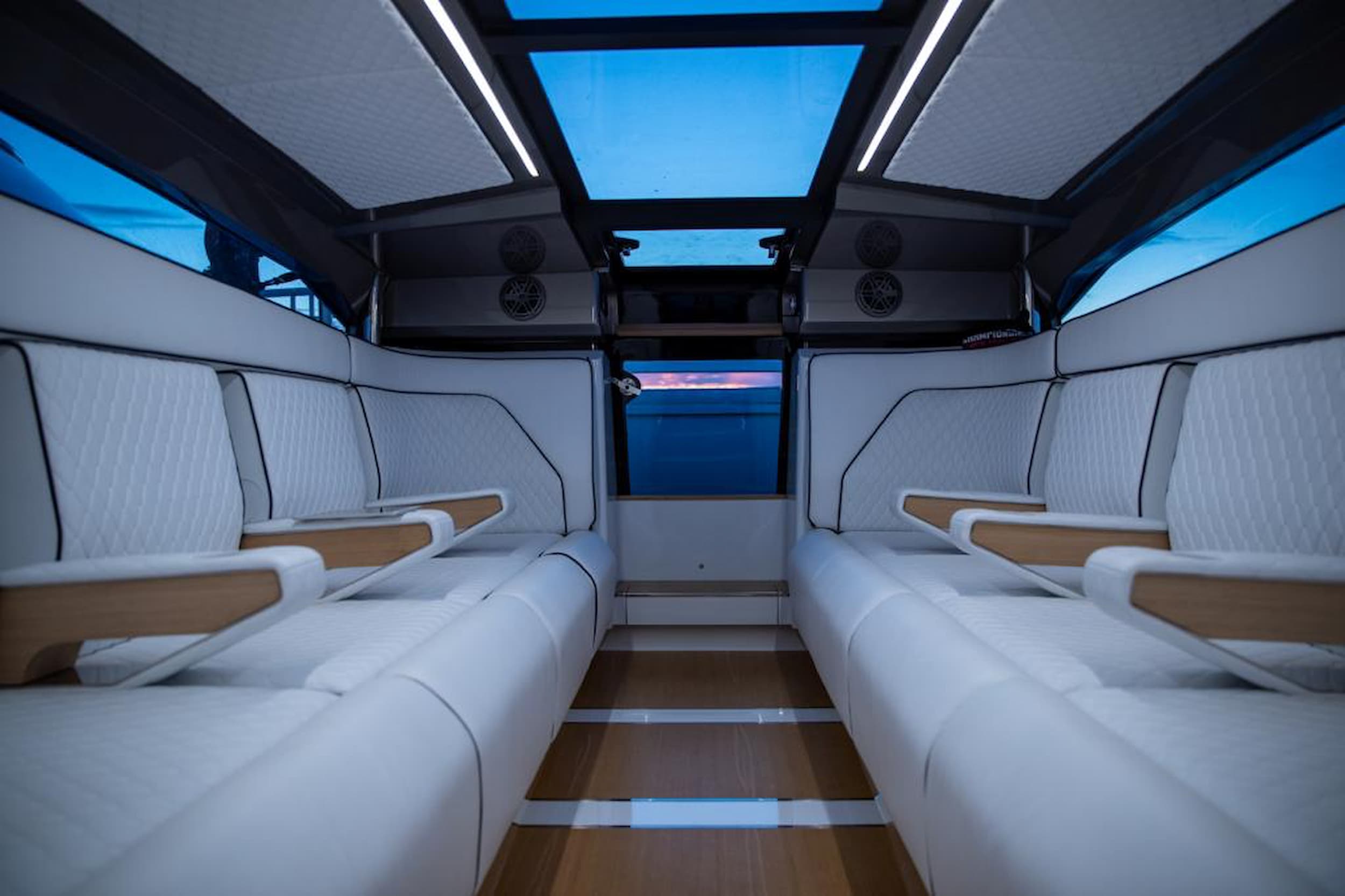 Step inside the fully enclosed cabin and you enter a quiet, climate-controlled space that feels worlds away from the elements. Panoramic windows keep the view open while keeping guests cool, dry, and comfortable, no matter the weather or sea state.